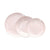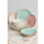A porcelán tányérok finom rózsaszín árnyalat, szabálytalan szürke pöttyök és koncentrikus körök díszítik, melyek természetes, kézzel készült hatást keltenek. A rusztikus és modern jegyek harmonikus kombinációja igazán egyedivé teszi ezt a darabot.