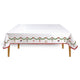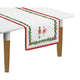 Ezt a meseszép karácsonyi asztalterítőt ünnepi minták díszítik, amelyek piros masnikkal átkötött fenyőágakból és arany csillagokból állnak, kiemelve a karácsony meghittségét.