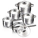 A rozsdamentes acél fogantyúk arany PVD bevonattal rendelkeznek, ami elegáns megjelenést kölcsönöz nekik. Az edzett üveg fedők könnyen záródó, hőálló szilikon kialakítással készültek, és gőz nyílással vannak ellátva, hogy a főzés során a gőz könnyedén távozhasson.