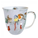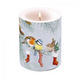 Havas, téli hangulatot idéző, fenyőfán üldögélő madárkákat és apró karácsonyi ajándékzoknikat ábrázoló díszítés.