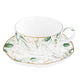 Porcelán kis desszertes tányér elegáns levél mintával. A tányér különlegességét kissé egyenetlen széle adja, melyet arany színű szegély vesz körbe.