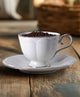 A hófehér porcelán tökéletesen harmonizál az aprólékosan kidolgozott dombornyomott peremmel, míg az aranyszegély egy csipet eleganciát csempész minden alkalomhoz. A csészealj nem csupán dekoratív – praktikus megoldásként kanalat vagy apró süteményt is elhelyezhetsz rajta, így óvva az asztalt a foltoktól.