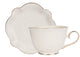 A szett minden darabját egyedi, növényi mintázatú domború dekoráció ékesíti, amely finom csipke hatását kelti. Az elegáns porcelánt egy széles, tükörfényes csík és az edények szélét körülölelő arany vonal teszi még exkluzívabbá.