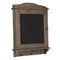 Rusztikus barna színű fa fali kulcsos szekrény 6 akasztóval, felírótáblával, alul 3 darab fogassal, a tetején levéltartóval.