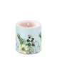 Ez a karácsonyi átvilágítós viasz gyertya egy igazán elegáns és természetes hangulatot áraszt, amelynek központi eleme a finoman megrajzolt fehér mikulásvirág. A gyertya háttérszíne világoskék, ami szinte havas téli tájat idéz. A növények között fenyőtobozok, örökzöld levelek és bogyós növények is megjelennek, amelyek tökéletesen kiegészítik a kompozíciót, igazi ünnepi hangulatot teremtve.