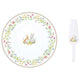 A virágokkal és nyuszikkal díszített étkészlet autentikus húsvéti hangulatot áraszt, és kiválóan illeszkedik a tavaszi szezon ünnepi eseményeihez.