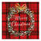 Téli hangulatot idéző, piros kockás háttérrel, fehér fagyöngyből készült koszorút, benne Merry Christmas feliratot ábrázoló díszítés.