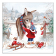 Téli hangulatot idéző, szamár nyakába sálat akasztó kisfiút és szánkón ülő, kötelet rágcsáló kiskutyákat ábrázoló díszítés.
