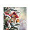 Ez a karácsonyi szalvéta egy varázslatos téli tájat ábrázol, ahol két bájos kis vörösbegy madár, egy hóval borított madáretető körül pihennek. A madáretetőt fenyőágak és piros bogyók díszítik, melyek felerősítik az ünnepi hangulatot. A hópelyhek gyengéden hullanak, miközben a háttérben egy téli erdő sejtelmesen elmosódik a távolban.