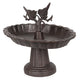 Dekoratív falevél alakú öntöttvas kerti madáritató, madáretető, melynek oldalán egy kis madárka csücsül. A madarak biztosan hálásak lesznek Neked, és gyönyörködhetsz szépségükben is.