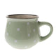 Nosztalgikus hangulatot idéző pöttyös kerámia bögre, pisztácia zöld alapon fehér pöttyökkel.