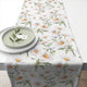 Minőségi pamut fehér színű asztali futó, melyet bájos kék apró rózsák díszítenek.