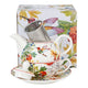 Levendulás porcelán egyszemélyes teáskészlet szűrővel díszdobozban, mely tartalmaz egy kis teáskannát, fém szűrőt, egy porcelán csészét és a hozzá tartozó aljat.