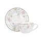 Két személyes készlet, finom pasztell színű csészék, hozzá tartozó aljjal, virágdíszekkel és arany színű szegéllyel.