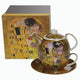Ez a gyönyörű teáskészlet tartalmaz egy porcelán teáskannát, és egy porcelánból készült teáscsészét, aljjal.