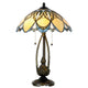 Ez a gyönyörű Tiffany asztali lámpa lenyűgöző barna , kék és változatos színes üvegelemekkel készült, melyben gyönyörű szitakötő kompozíció fedezhető fel.