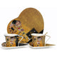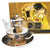 Különleges Klimt A csók festményével díszített porcelán teás szett. Az 1 személyes teázó tartalmazza a kannát, mely egyben csésze is, a porcelán szűrőt, tetőt és a csészealjat.