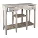 Ez a vintage stílusú, fából készült díszes konzolasztal igényes és dekoratív bútordarab romantikus otthonokba, irodába, váróterembe. Felülete régies hatást keltően erősen antikolt, koptatott, 3 fiókkal rendelkezik.