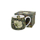 A bögre külsejét pasztell, finom színekben légies liliomfonatok és díszes levelek díszítik, felidézve a művész munkásságát.