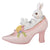 Húsvéti dekoráció figura Rózsaszín cipőben csücsülő fehér nyuszi.Méretek: 13x5x12 cmAnyaga: polirezinSzínek: Rózsaszín , zöld, bézs