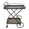 Rusztikus jellegű fekete zsúrkocsi kerekekkel.